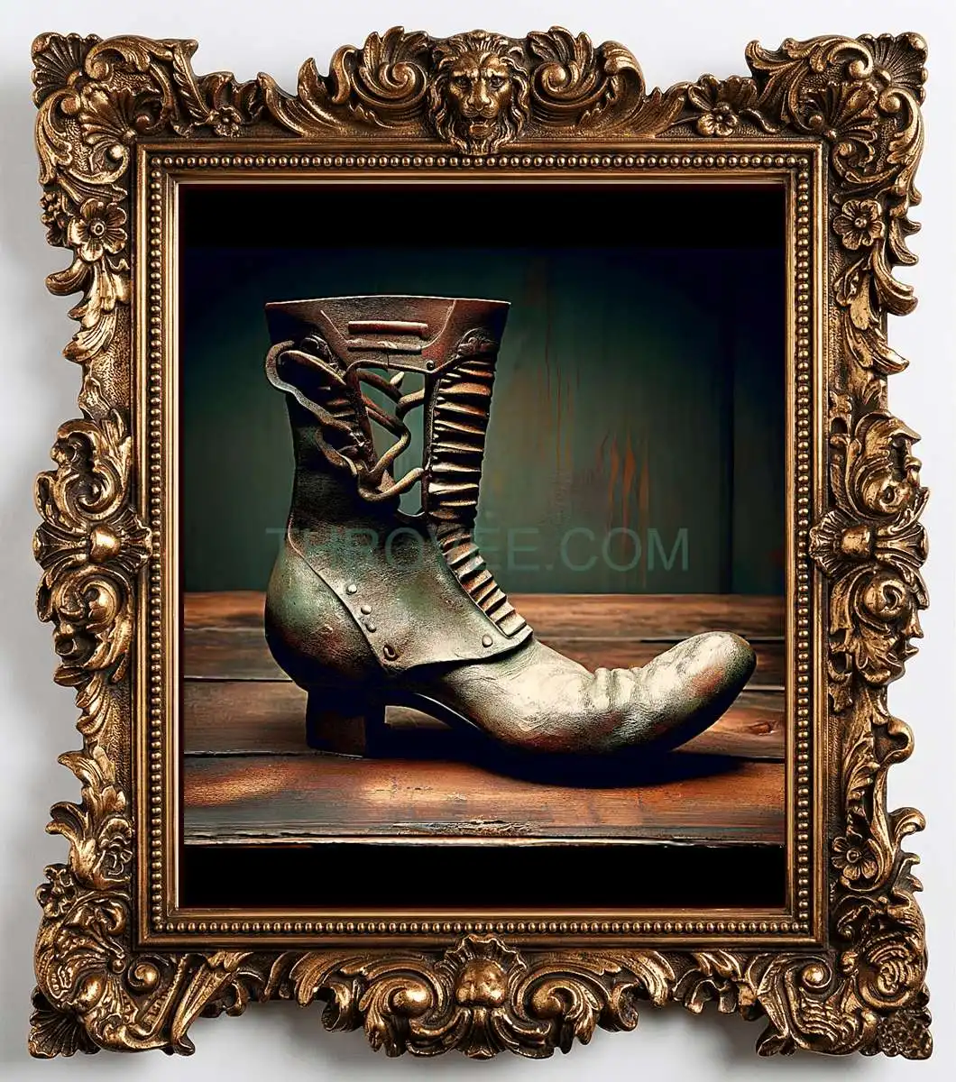 Materials: Distinguished by a weathered sage and copper-verdigris patina over aged leather. This artifact is uniquely characterized by its open-frame ladder lacing system and a prominent upward-swept toe box. Featuring a reinforced, studded heel counter and an integrated leather pull-loop collar, the boot showcases the transition from mid-Victorian formal military structure to rugged, industrial-era utility. This piece forms the cornerstone of the “Copper, Leather & Wood Artifacts” collection.